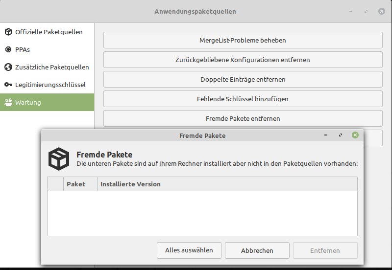 Erneuter Klick auf Listeneintrag: "Wartung" - "Fremde Pakete entfernen"